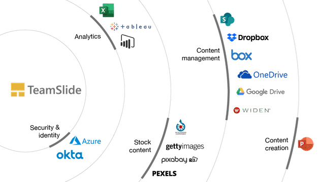 TeamSlide can connect to your content management system (CMS), such as Box or SharePoint. This allows you to continue using your CMS as your single-source-of-truth, importing your existing metadata, and leveraging the CMS’ powerful file management capabilities.