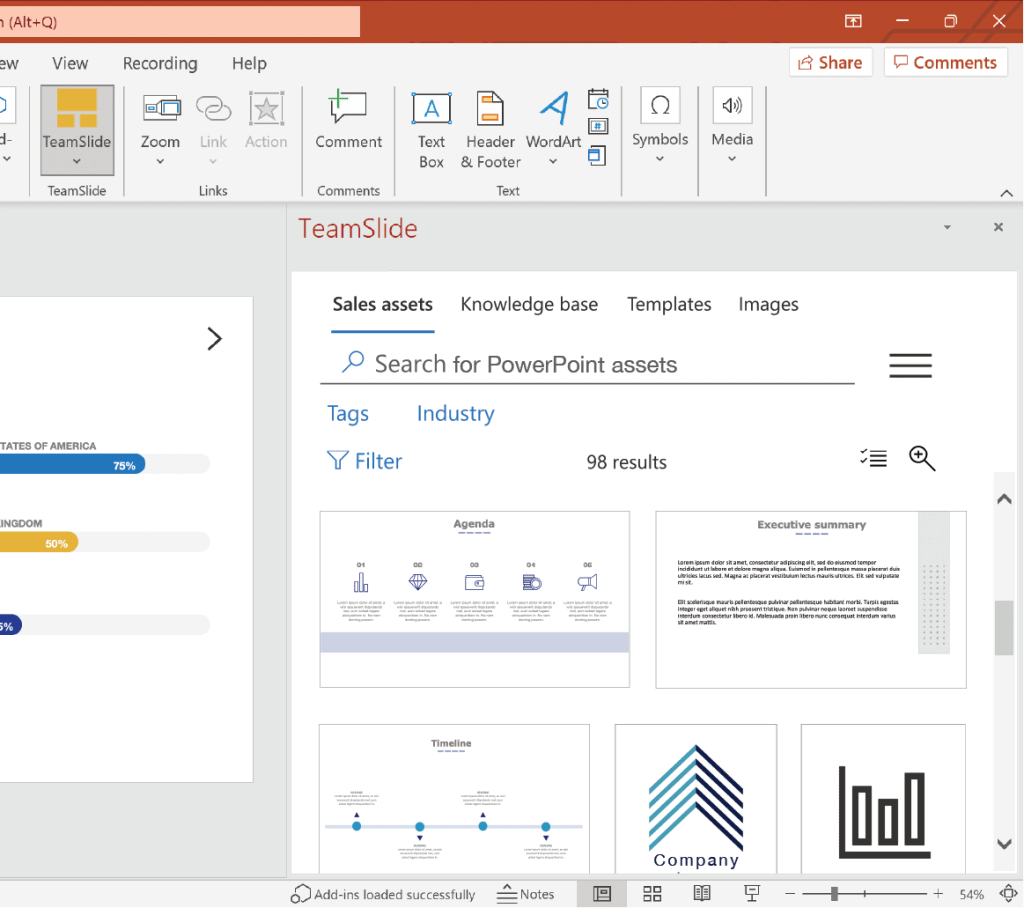 TeamSlide provides users with instant access to your latest PowerPoint collateral ensuring that they always have access to on-brand and accurate slides. Further, our version control feature identifies slides that are outdated and informs the user, allowing them to review and accept updates with a click.