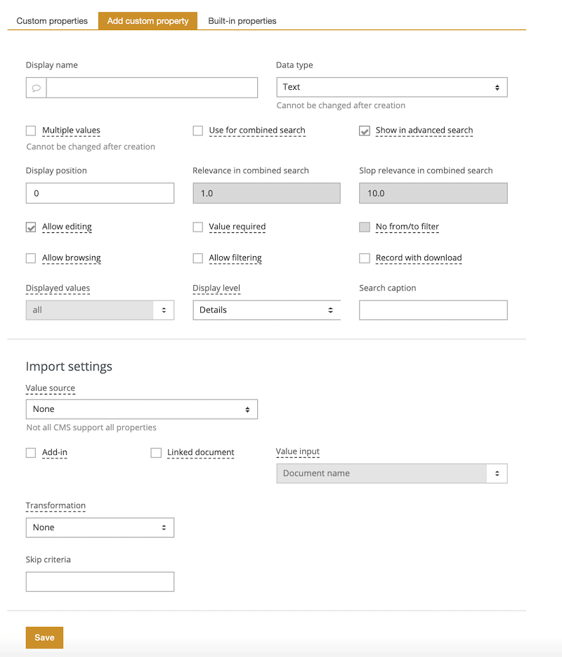 - Allow editing If checked, users with edit permissions will be able to make changes. Do not check for a property pulled from your content system (e.g. SharePoint)