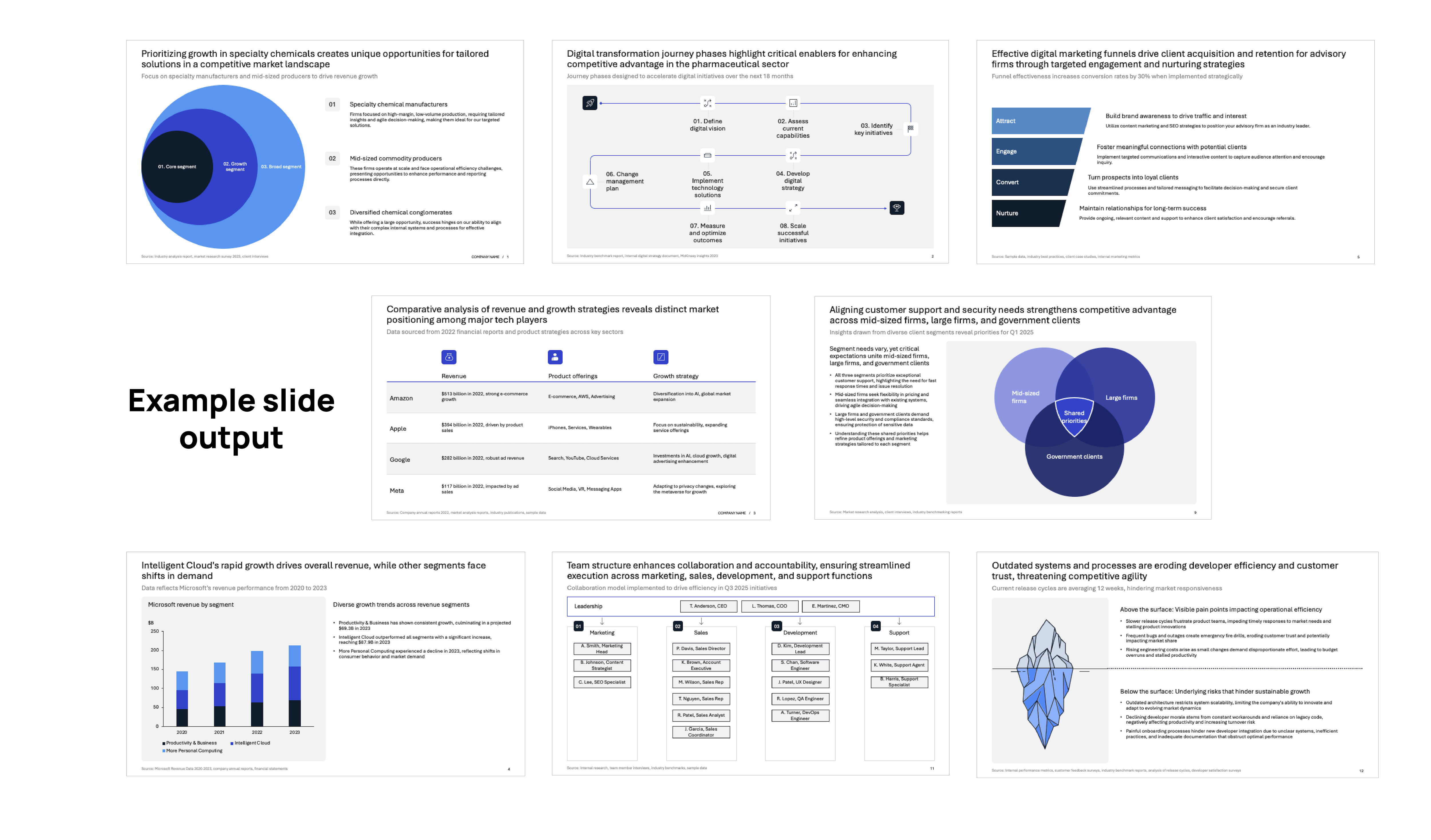 No. TeamSlide is designed to speed up slide creation, not replace designers or consultants. It handles the repetitive, time-consuming work so your team can focus on the story, insights, and client-specific details.