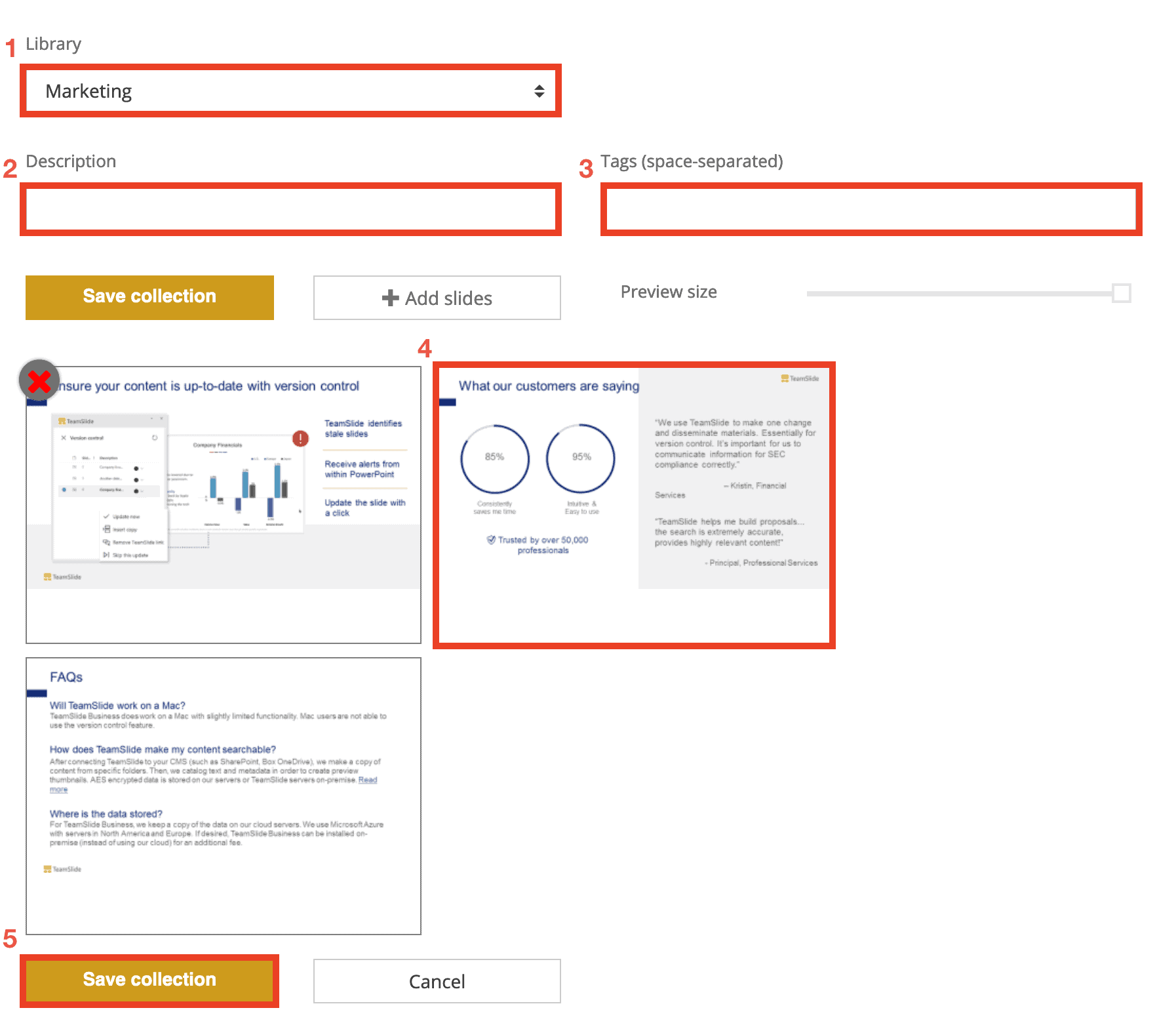 At times, you may want to group slides so that they will be inserted into your presentation together. Examples include legal slides or mini-stories that require a few slides to communicate like a company introduction or product screenshots. To address this use case, TeamSlide offers a Collection feature.
