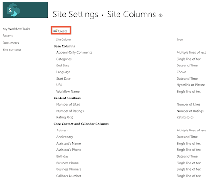 4. In the ‘Site columns’ page, click ‘Create’ at the top.