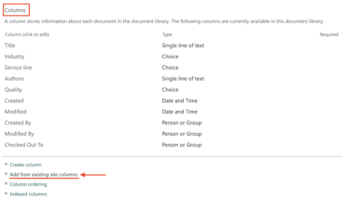 3. Scroll down to the ‘Columns’ section.Select ‘Add from existing site columns’.