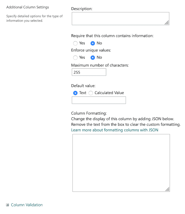8. In the next section, Additional column settings, you can further customize the column. The options in this section will vary based on the type of information you selected earlier.