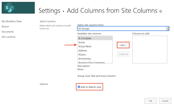 Click the site columns you want to add and select ‘Add’. This will move the column you’re adding to the ‘Columns to add’ list box.
