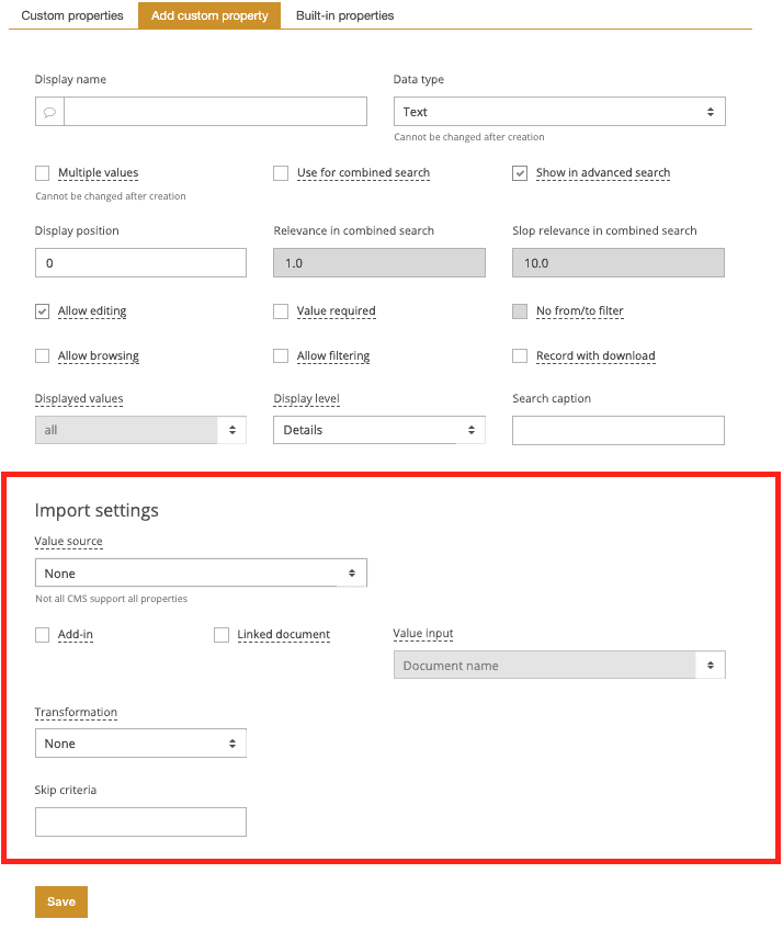 4. After configuring the custom property settings, click Save. (Note: Skip any settings under Import settings if you aren't importing values from a content system)