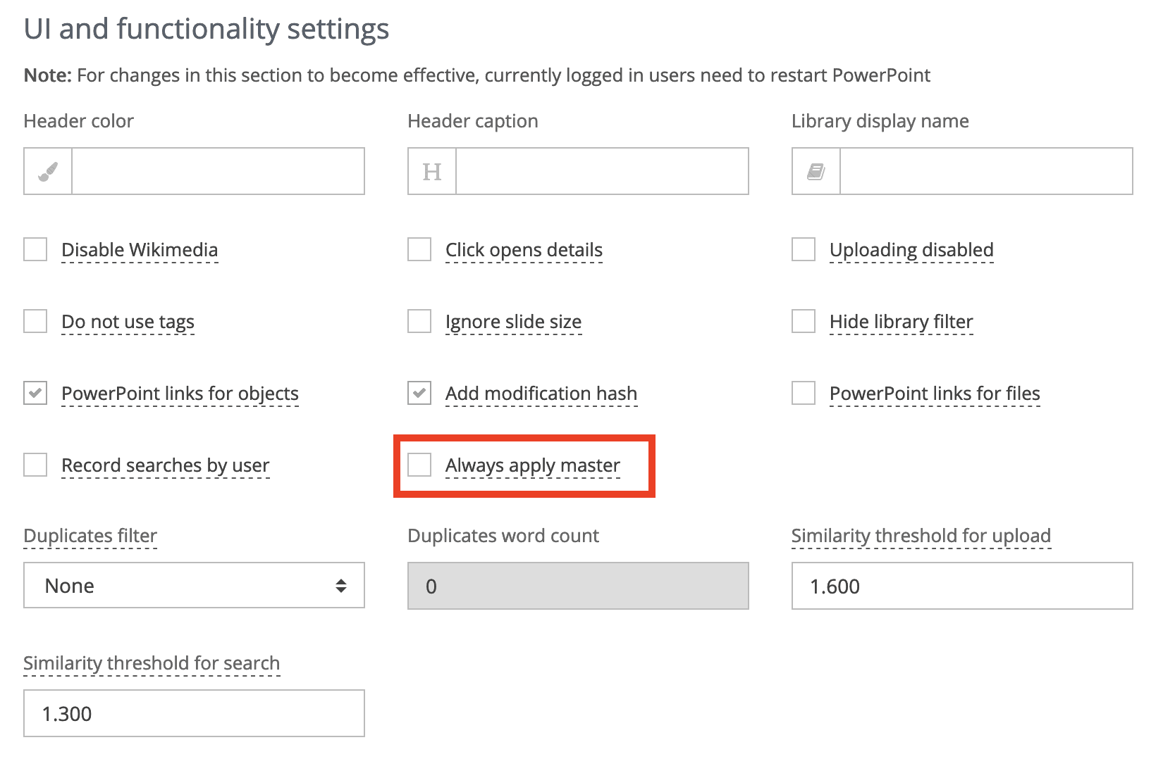 - If you want to ensure that the original master is the default, check Always apply master. If you prefer that active master from your current presentation is applied, leave it unchecked.